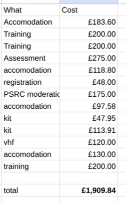 I did Coastal Leader training twice (once had a second day cancelled because the weather was too good). This gave me experience of a range of conditions including getting blown out to the atlantic once (we got stuck on a rock called Goat Island and had to paddle hell for leather two on a board into land to end up several miles from the cars). I did Open Water Coach training (two days). I used cheap B&B and AirBNB for these (I like car camping but not in winter and having a toilet to use is pretty invaluable). I did an RYA VHS SRC licence for the radios. I also did a marine navigation course (RYA Day Skipper syllabus). I bought a load of lights, high vis jackets, dry bags and other kit. You have to pay Paddle Scotland to register. With travel at a laughable 45p per mile and the final assessment total costs were about £2800. Erk.
